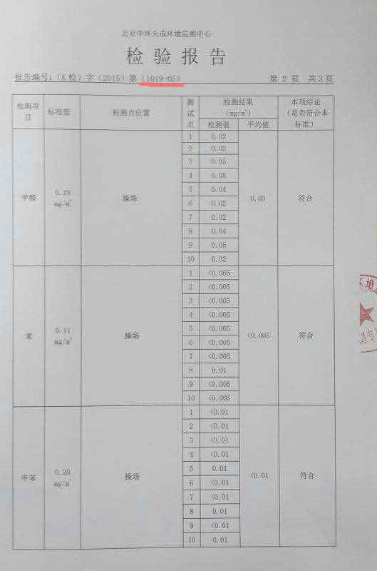 在家长们的坚持下,11月12日学校通过北京丰台一家公司对于学校室内室外空气进行了检测,并出具了一份全部指标合格的检测报告。但这份报告同样疑点重重:第一,由中环天成环境监测中心提供的这份监测报告封面原有室内的“内”字改成了“外”字,报告明确表示禁止涂改,并且第一页所有的内容都是打印的“室内”;第二,监测报告第一页和第二页的报告编号不统一,第一页注明1109-05,第二页则变成了1019-05。