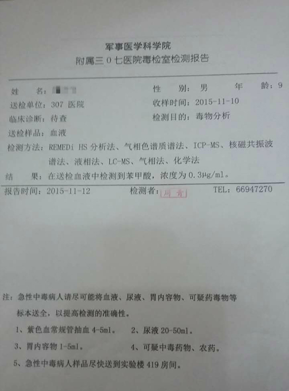等待结果那两天对于女士而言是一个煎熬的过程,两天之后的晚上,她拿到结果,毒检报告上“苯甲酸”三个陌生却又可怕的字眼,像刺一样戳痛了于女士的心:“送检我只是希望能够让自己安心,并不相信真的有问题。但当我拿到报告显示我孩子血液里含有苯甲酸成分的时候,我脑子一下子懵了。我甚至不敢想象如果我孩子的血液里带着毒素未来会有什么影响……”