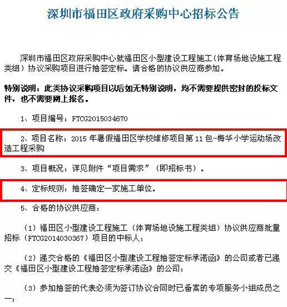 赵文海所说的“幸运中标”引起了腾讯体育极大的注意,当记者查阅了深圳市这几所学校的招标公告后,却发现,校方确定工程中标方的方式竟然是——抽签确定。于是,事关孩子们身体健康大计的学校塑胶跑道的修建工作就这样随机地交给了命运。