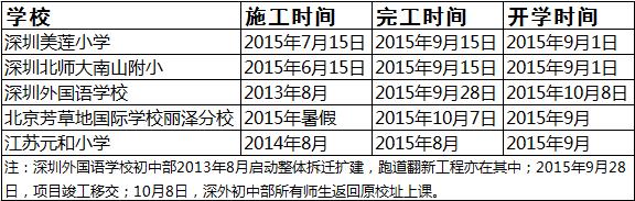 记者总结了此前深圳市教育局公布的11所塑胶场地疑似有害物质超标学校的施工信息却发现,其中有好几所学校出现施工后马上开学或者边施工、边上学的情况。