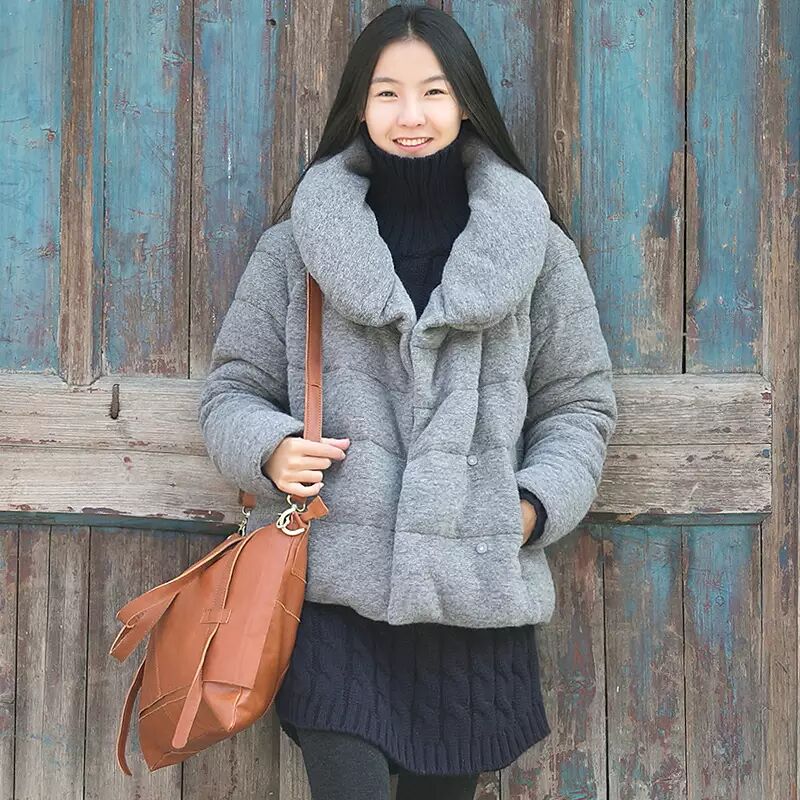 大大的高领,可以翻下来变成大苹果领,御风保暖效果相当好。灰色非常的衬肤色,气质娴静,安然自若。毛呢面料的设计,很个性独特。