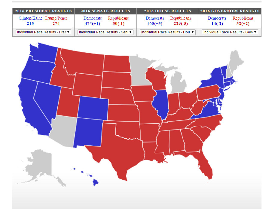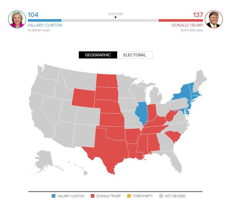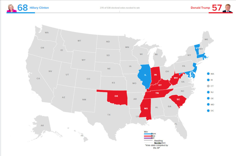 特朗普赢得俄克拉荷马州(共和党铁盘州)选举、印第安纳州、肯塔基州(共和党铁盘州)、西弗吉尼亚州(共和党铁盘州)选举。希拉里赢得特拉华州(民主党倾向州)、马里兰州(民主党铁盘州)选举、哥伦比亚特区(民主党铁盘)选举、马萨诸塞州(民主党铁盘州)选举、新泽西州(民主党倾向州)选举、佛蒙特州(民主党铁盘州)选举。