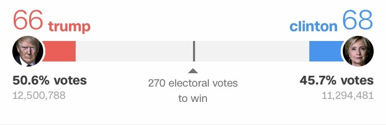希拉里的票仓在东海西海岸的各大城市,现在西海都还没有开始记票,这些都统计之后,希拉里会追上来(比如加州直接就55选举人票,基本是希拉里的)。比如刚才的纽约,才刚刚统计了2%得票数的时候就已经直接宣布希拉里赢了,因为纽约人80%以上都投希拉里. 这又是29选举人票。