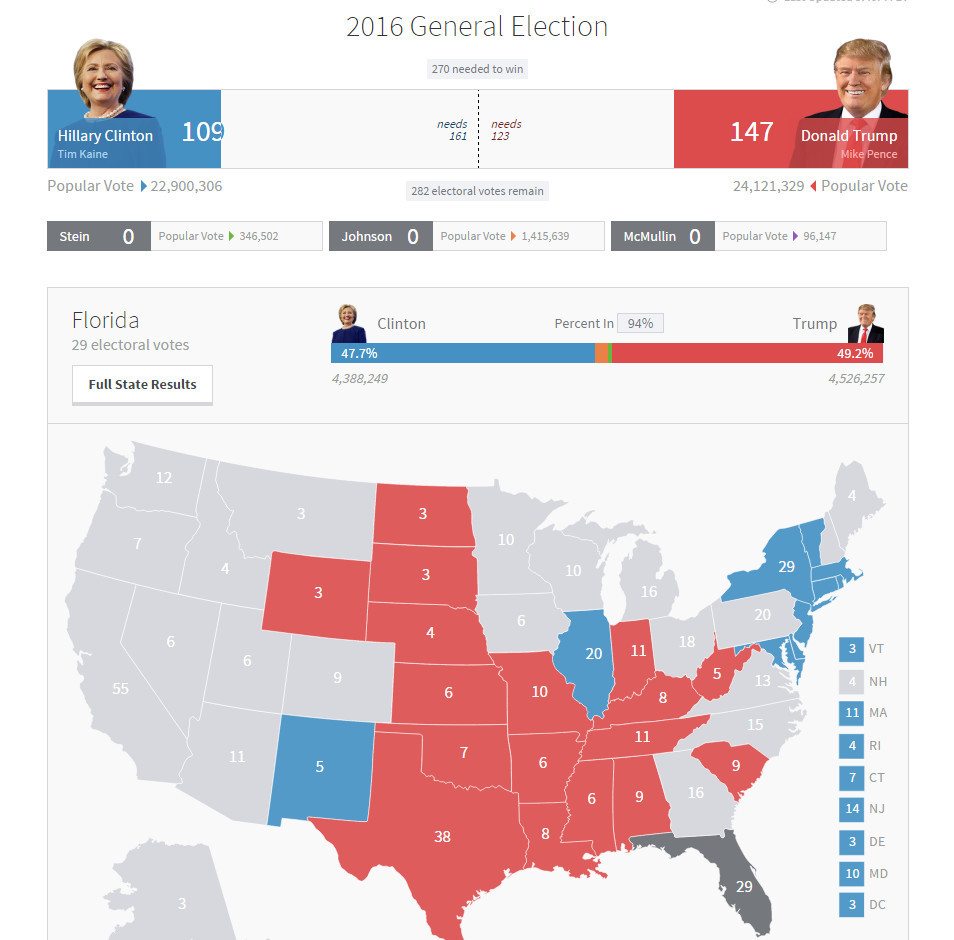 北京时间10点50分:特朗普无比接近拿下佛罗里达 纽约时报预测希拉里胜率下降