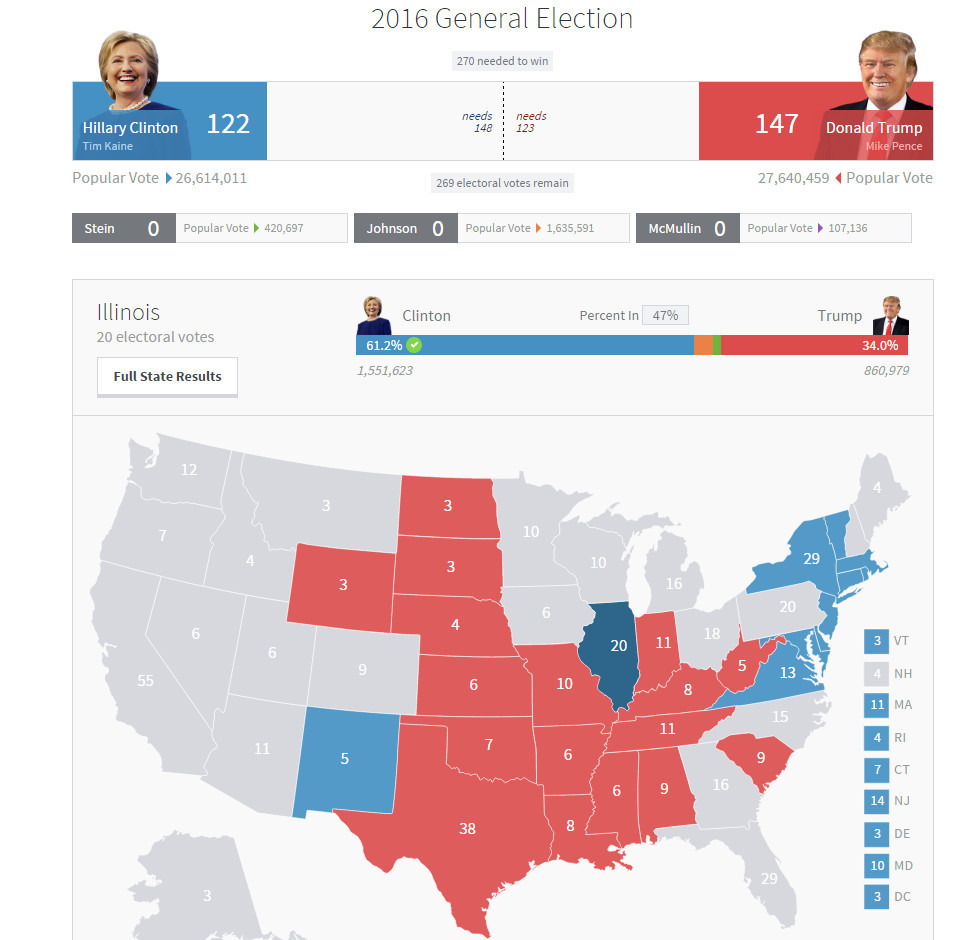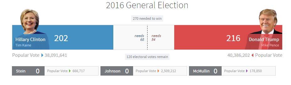 三大关键州目前选票情况:1、佛罗里达:特朗普49%,希拉里47.7%;2、北卡罗莱纳:特朗普50%,希拉里47.3%;3、弗吉尼亚:特朗普47.3%,希拉里47.5%。据BBC报道,没有迹象表明希拉里将提前赢得大选。一些评论员此前曾猜测,如果希拉里·克林顿赢得一个关键州,比如佛罗里达州,那大选很可能提早结束。但是,随着特朗普的微弱优势,和一些重要州,如乔治亚州还未公布结果,我们很可能不会太早知道选举最终结果。