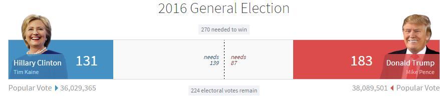 特朗普183:131领先希拉里,来源FOX