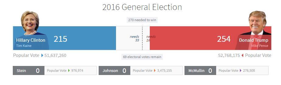最新选情分析:希拉里必须赢下其他所有悬而未决州,即密歇根、宾夕法尼亚、新汉布什尔和内华达,才能形成269比269的平局。现在希拉里已陷入困境。