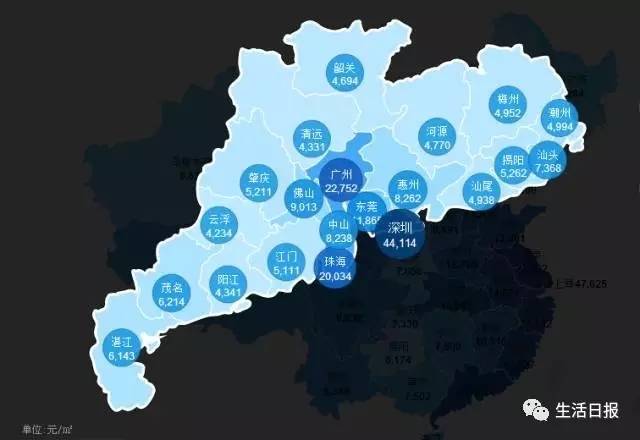再看看,经济总量第一,更加发达的广东省。广东的深圳、珠海、广州(省会),房价分别是4.4万,2.0万,2.2万,同省其他地市,差异更加悬殊。只有东莞房价超过1万,其他城市大部分在4000/5000/6000左右。