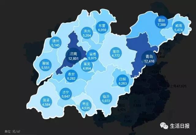 比如,经济总量排第三的山东。山东的济南和青岛,都在均价12000左右,而同省其他城市,潍坊菏泽莱芜均在5000以下,枣庄、临沂、德州、聊城、济宁、滨州威海,不及济南、青岛的一半;