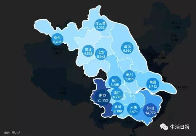 还有经济总量排第二的江苏省,南京的房价2.4万,苏州1.4万,苏州经济实力好于南京,而房价竟然跟南京相差1万。而同省其他城市则在6000-8000左右。差距同样明显。
