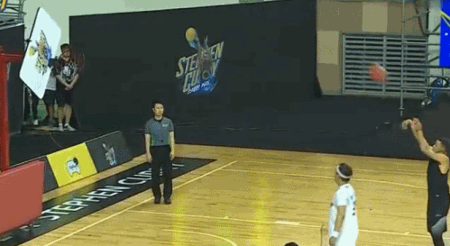 来到中圈投篮,原本以为得尝试多次,结果库里居然又是第一次尝试就命中。