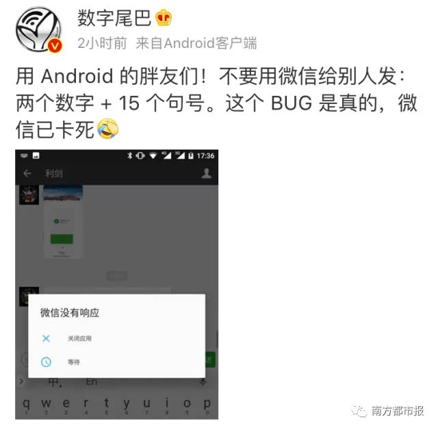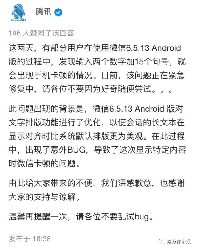 这两天,有部分用户在使用微信6.5.13 Android 版的过程中,发现输入两个数字加15个句号,就会出现手机卡顿的情况。目前,该问题正在紧急修复中,请各位不要因为好奇随便尝试。。。