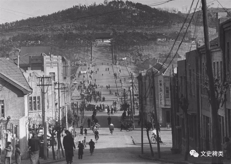 1948年,站在绥远路看大庙山上的日本青岛神社,此时山下的鸟居已经被拆拆,而整个神社则是在1950年被拆掉了