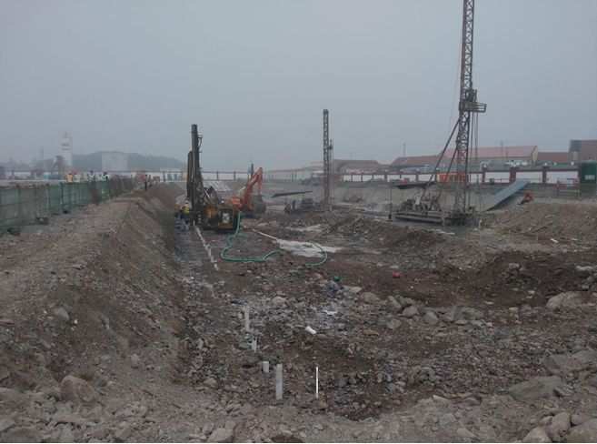 1号线海底隧道3号斜井明挖基坑处于填海滨海区域,地下水位受潮汐涨落往复改变,高潮时地下水位渗入严重影响现场施工。现场设置“素混凝土止水墙+A800@600双重咬合高压水泥旋喷桩”帷幕,深入基岩面1m以下,构成了密闭的止水帷幕,完美解决了潮汐对施工的影响。