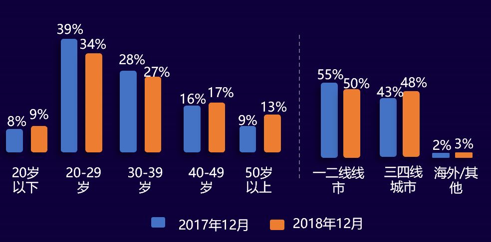 用户已经习惯于在生活中使用小程序来获取服务。截至2018年12月底,小程序日均使用频次比去年提升了54%,大盘用户的次日留存从34%增长到54%。小程序逐渐受到更多40岁以上的中老年人群的欢迎,三四线城市和一二线用户比例几乎持平,海外地区的小程序用户也在不断增长。