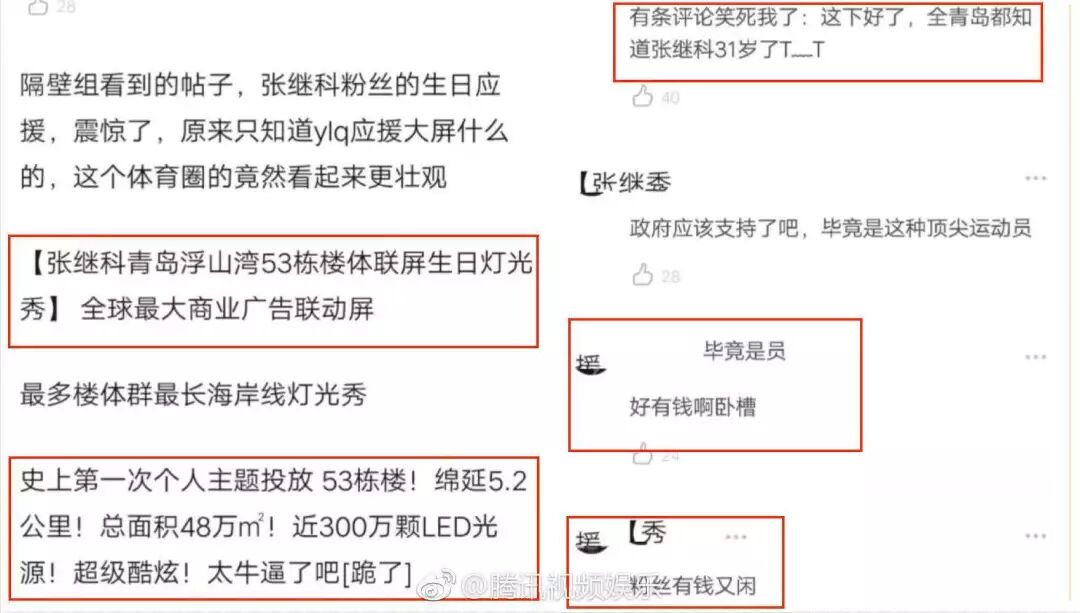 对于张继科粉丝如此土豪的应援方式,网友也是纷纷投以羡慕的眼光,“全青岛都知道张继科31岁了”“张继科的粉丝好有钱啊”“太厉害了”“太牛了”!