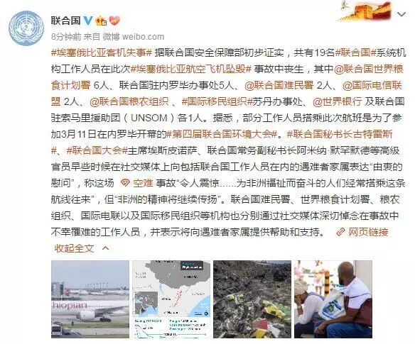 据联合国官方微博3月11日消息,据联合国安全保障部初步证实,共有19名联合国系统机构工作人员在此次埃塞俄比亚航空飞机坠毁事故中丧生。