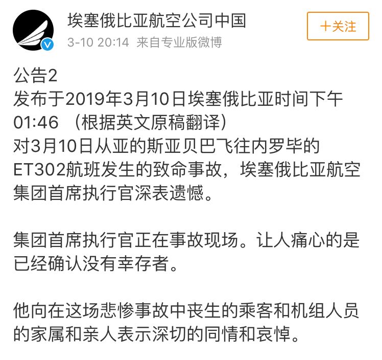 3月10日晚,埃塞俄比亚航空发布公告称,“让人痛心的是已经确认没有幸存者”。
