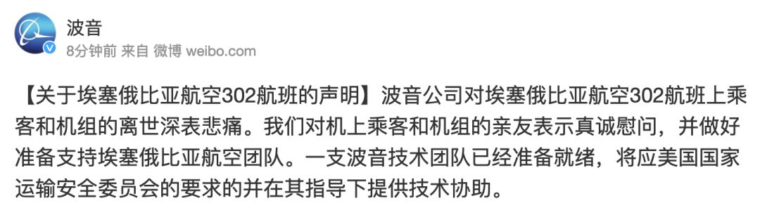 北京时间10日晚,波音公司也在新浪微博发布中文声明:深表悲痛,将提供技术协助。