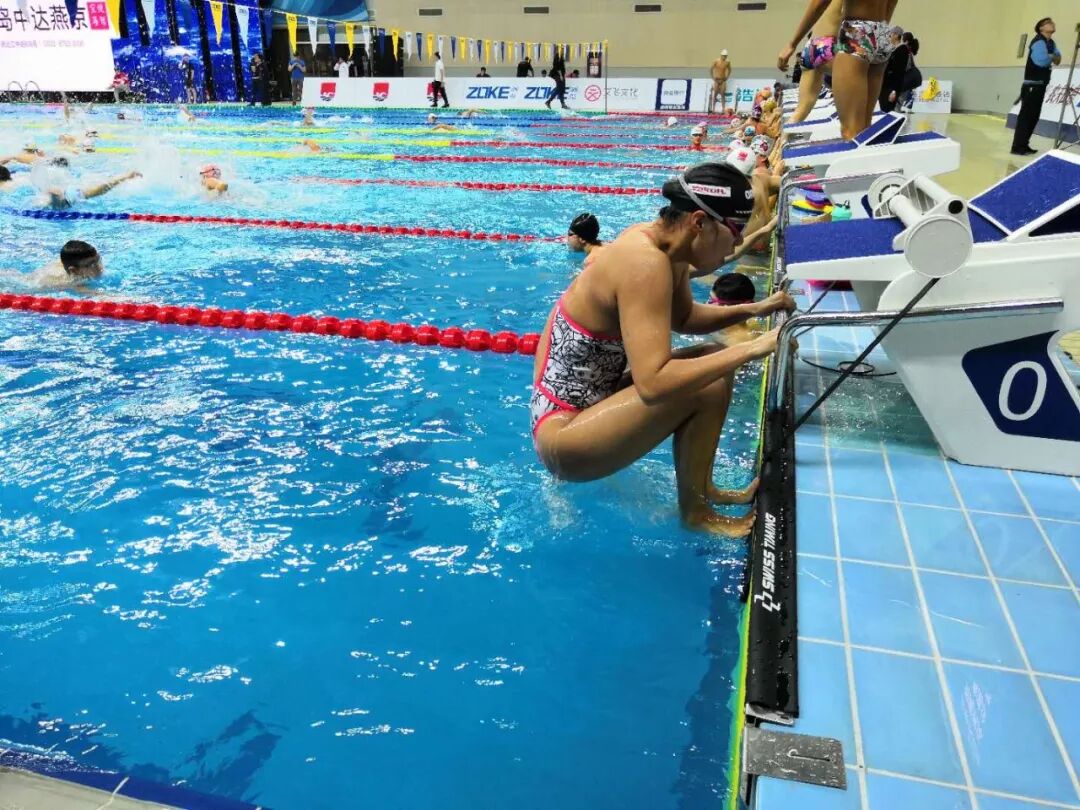傅园慧在泳池内认真训练仰泳出发。