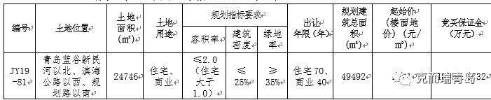 10月23日,1宗位于即墨蓝谷新民河以北、滨海公路以西、规划路以南的商住地上市,总建面4.95万㎡,将于11月13日上午拍卖,容积率2.0,起始楼面价2221元/㎡,起拍总价1.1亿元。本地块为鳌山卫街道新民社区安置用地。JY19-81地块竞买人需单独竞买,不允许联合竞买。