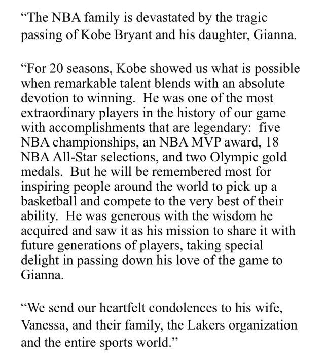 “在此,我们向科比妻子---瓦妮莎、科比家人、湖人队和整个体育世界表达沉痛悼念之意!”