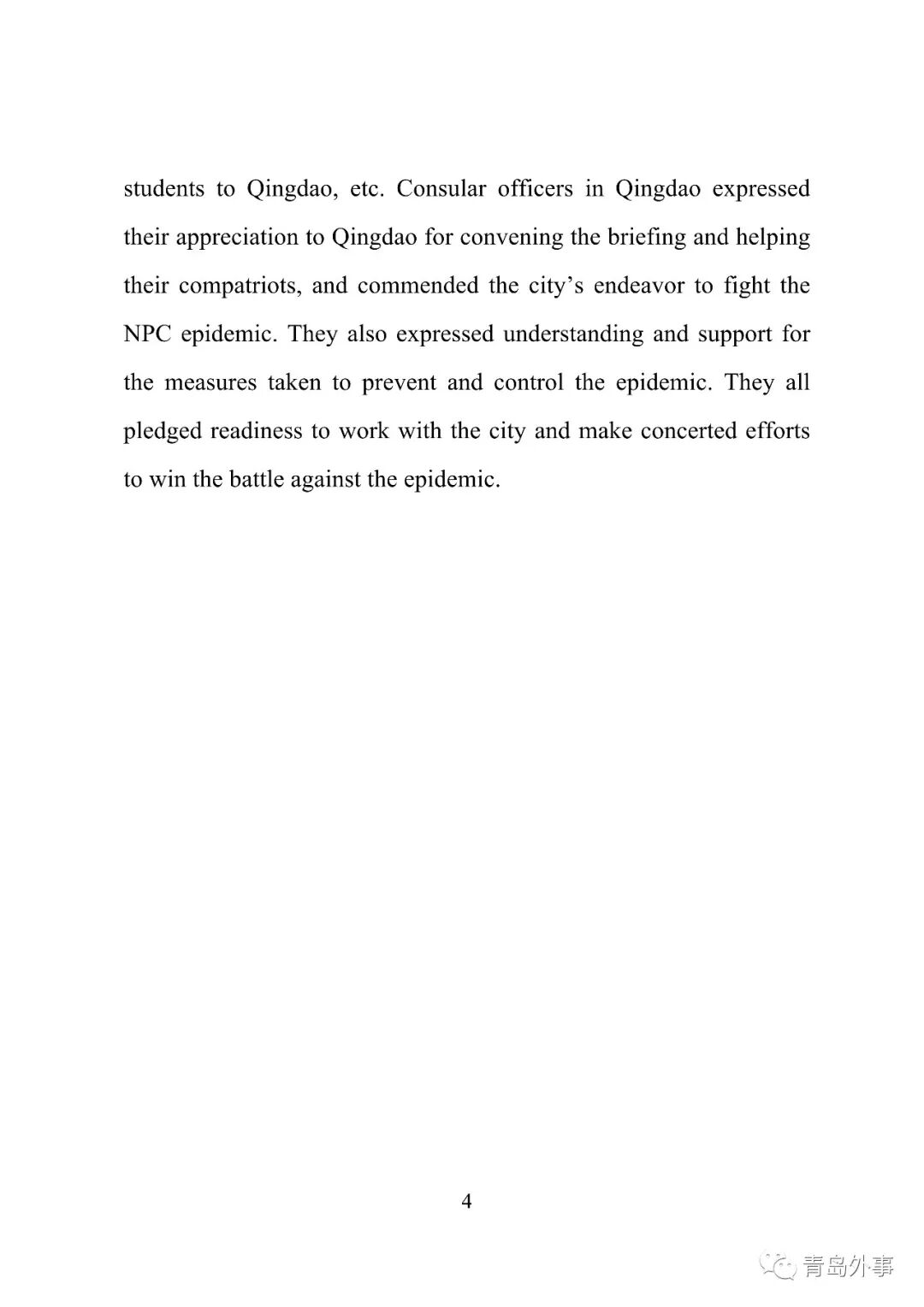 薛庆国副市长通报了近期我市在疫情防控、交通出行、企业复工复产、物资保障、外籍人员服务、教育、出入境等方面的情况,对驻青领事机构关注关心我市疫情形势、理解和配合我市疫情防控工作以及外籍人员、外资企业对青岛发展所作贡献表示感谢。他表示,新冠肺炎疫情发生以来,青岛市委市政府高度重视,市委书记、市长作为疫情防控指挥部的双总指挥,每天主持召开指挥部例会,已连续召开21次例会。全市上下坚定信心、同舟共济、科学防治、精准施策,同时间赛跑,与病魔较量,坚决打赢疫情防控阻击战;青岛市立足当前,着眼长远,一方面抓实抓细疫情防控,另一方面分类施策复工复产,全面统筹抓好疫情防控和改革发展稳定各项工作。目前,我市疫情防控总体处于平稳可控的状态。薛庆国表示,我市在严格做好疫情防控工作的同时,将继续保持同外国驻青领事机构的密切联系,主动关注和回应领馆及其在青侨民的合理关切,及时协调解决各类困难。市外办主任牟俊典在通报会上介绍了我市通过开通英语、日语、韩语、泰语、德语、法语、俄语、西班牙语八个语种的24小时咨询服务热线、微信公众号多语种信息推送等举措为我市外籍人员提供政策咨询、协调解决有关问题等工作情况。
