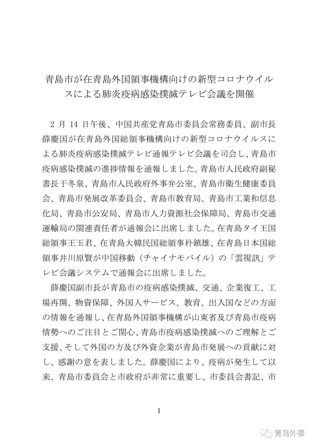 2月14日下午,市委常委、副市长薛庆国主持召开面向外国驻青领事机构的新冠肺炎疫情防控视频通报会,通报我市疫情防控工作有关情况。市政府副秘书长于冬泉,市外办、市卫生健康委、市发展和改革委、市教育局、市工业和信息化局、市公安局、市人力资源社会保障局、市交通运输局有关负责同志出席通报会。泰国驻青总领事王玉君、韩国驻青总领事朴镇雄、日本驻青总领事井川原贤通过中国移动“云视讯”视频会议系统出席通报会。