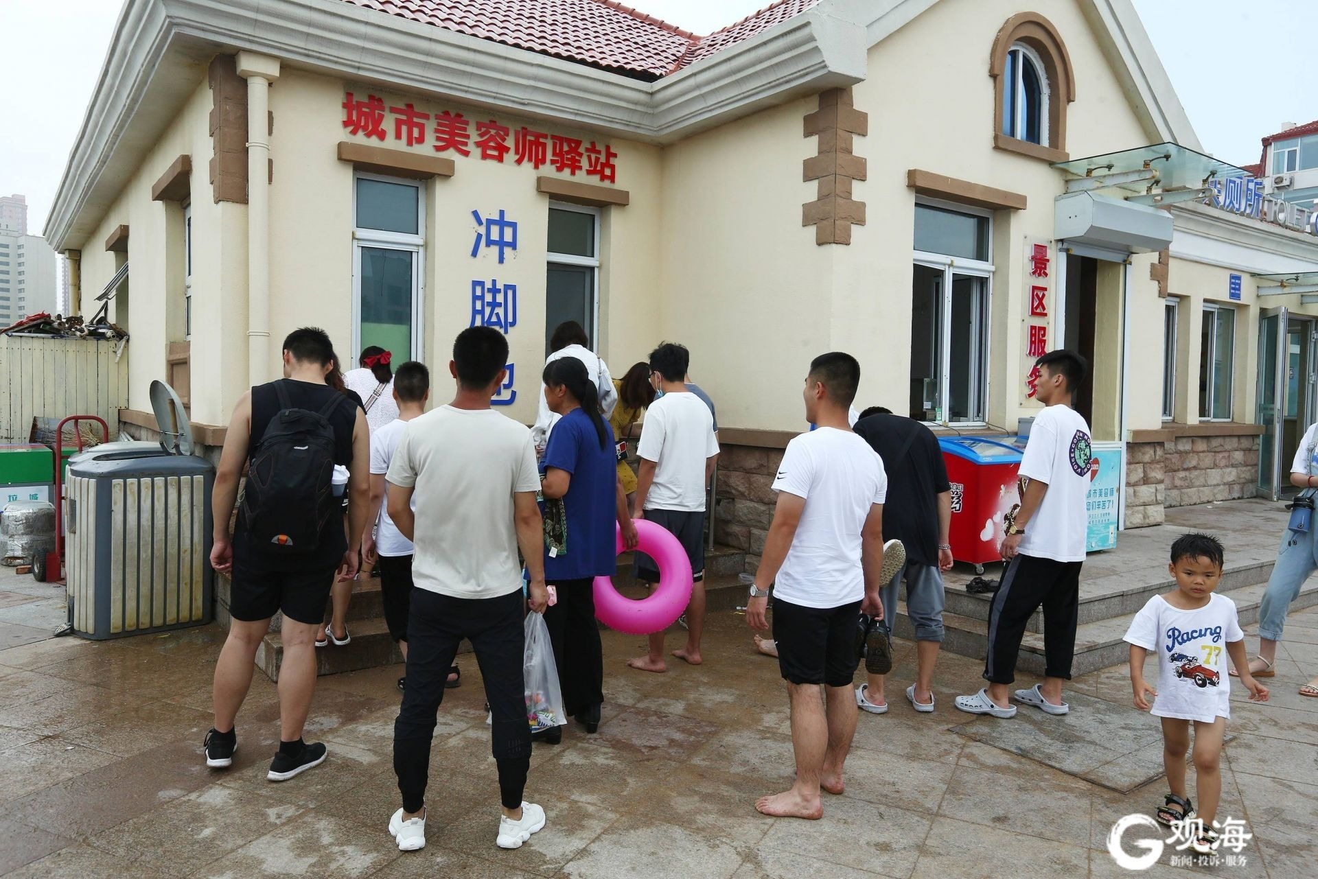 栈桥公厕:旅游旺季游客排队冲脚,冲脚池水龙头经常从早到晚不能关。臧磊 摄