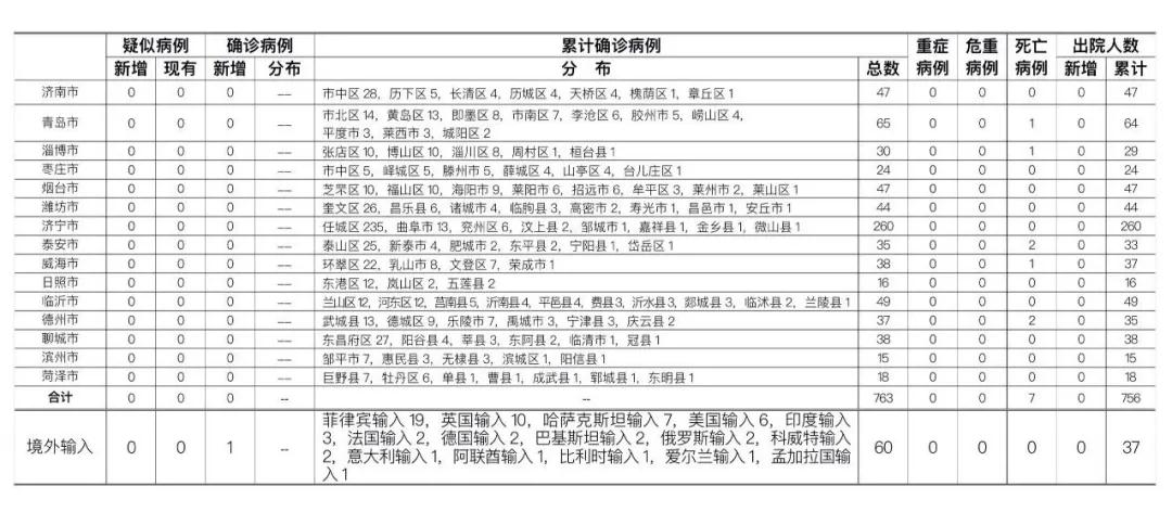 山东无本地住院疑似病例、确诊病例。累计报告确诊病例763例,死亡7例,治愈出院756例。