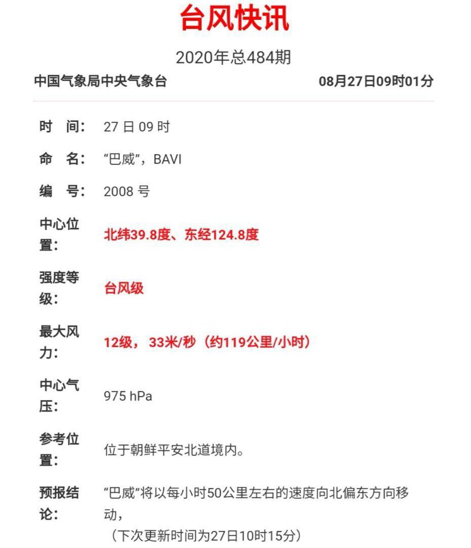 青岛日报社/观海新闻8月27日讯 今年第8号台风“巴威”的中心已于8月27日上午8时30分前后在中朝交界附近的朝鲜平安北道沿海登陆,登陆时中心附近最大风力有12级(35米/秒),中心最低气压为970百帕。