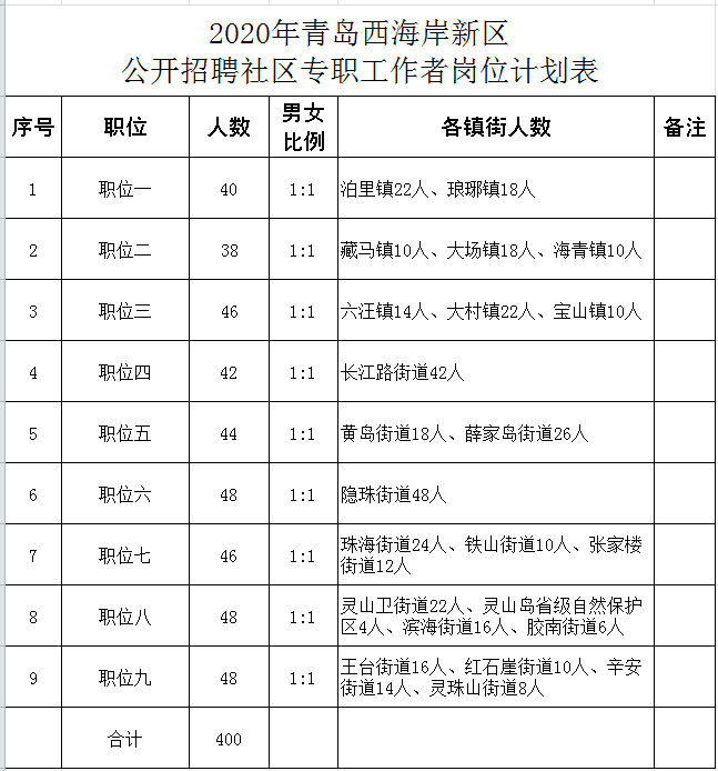 根据工作安排,共公开招聘社区专职工作者400名,按男女等比例招聘,其中,276名派往城市社区、124名派往行政村,从事城市社区和行政村综合公共服务工作。