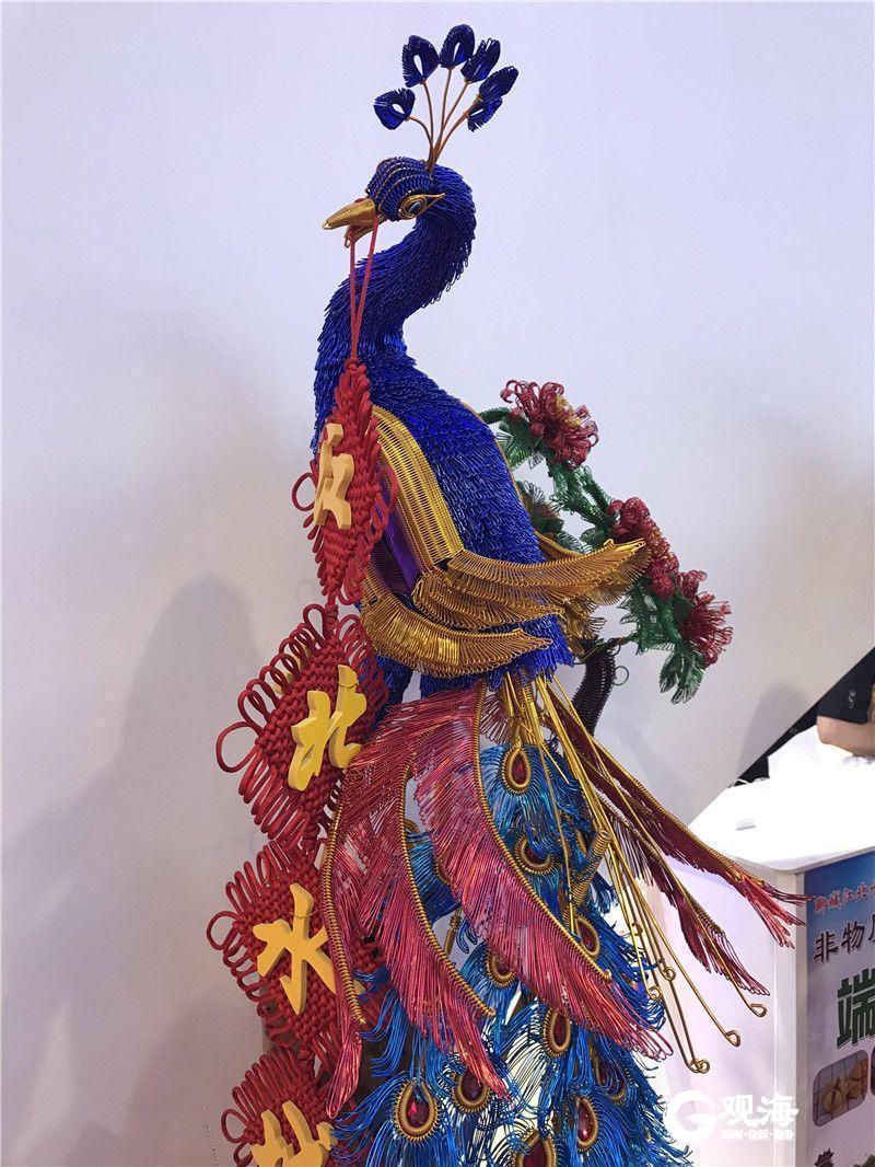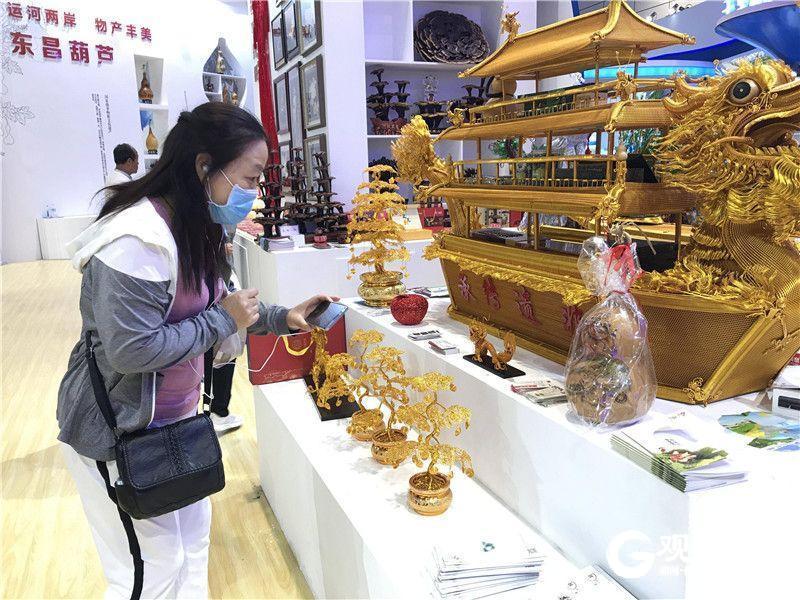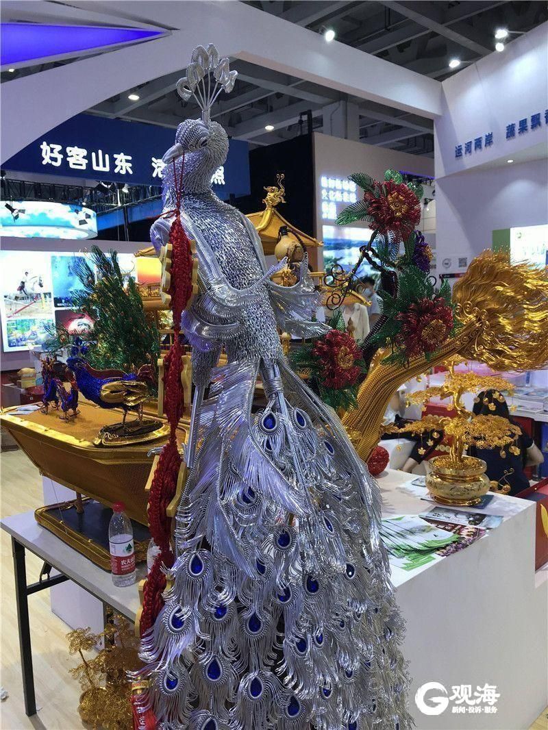 聊城展区前的几尊金丝孔雀格外引人注目,据了解,这是现代新兴的工艺品:铝丝编织。这几件工艺品将传统生产制作工艺和现代美学设计理念完美融合,引得参观者频频驻足拍照。除此之外,作为《水浒传》中武松打虎的故乡,聊城也将“三碗不过冈”的酒文化带到了展区现场,参观者可以在此驻足休憩,品味美酒。