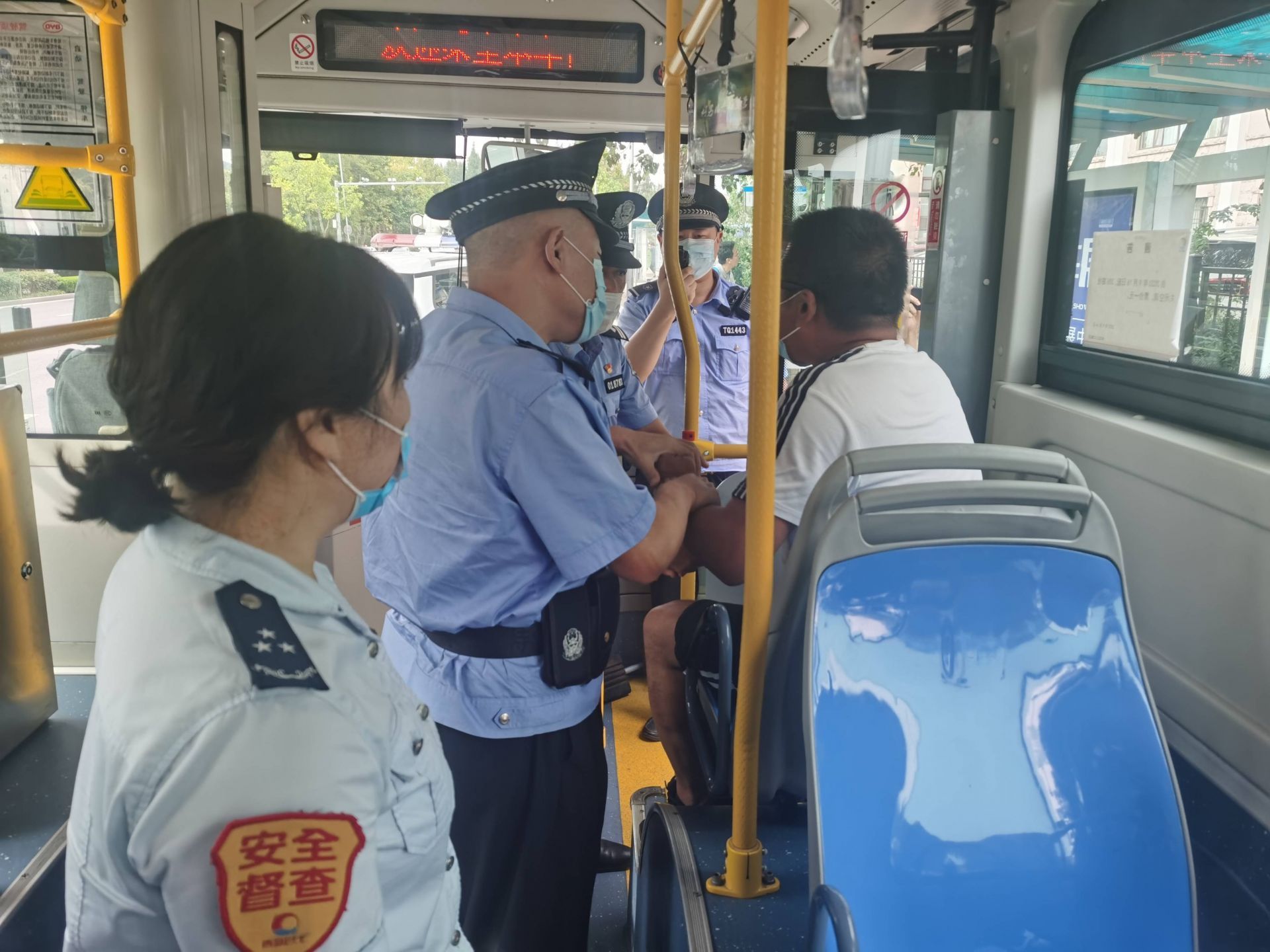 青岛日报社/观海新闻9月18日讯 9月17日14时,青岛市公安局110指挥中心突然接到6路DD846号车的报警信息,110接警民警马上通过无线网络实时传输系统调取了报警公交车的车内视频、音频信号,车厢现场的画面就被接进了110指挥中心大屏幕,远程监控画面显示:在天泰体育场车站,一位男性乘客携带了一桶不明液体,驾驶员正在要求查看,该乘客一再拒绝,情绪激动拒不配合,开始拉扯推搡、漫骂驾驶员。110指挥中心民警接警后不到1分钟,立即安排出警。与此同时,公交集团监控指挥中心、分公司调度指挥中心也接收到了相同的报警信息。3分钟后,4位特警与公交安全工作人员一起到达报警车辆现场,将危险乘客制服后带离。