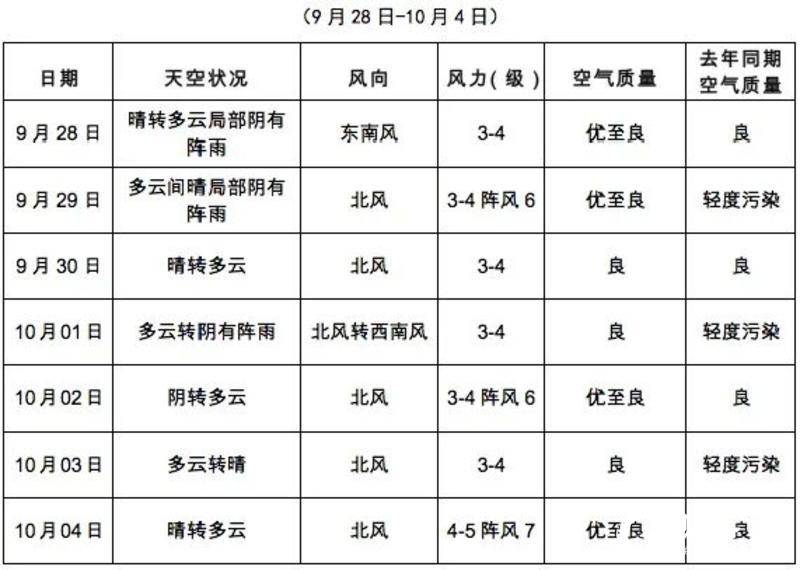 周四(10月1日),多云转阴有阵雨,北风转西南风,污染扩散条件较有利,预计空气质量为良,首要污染物为O3。