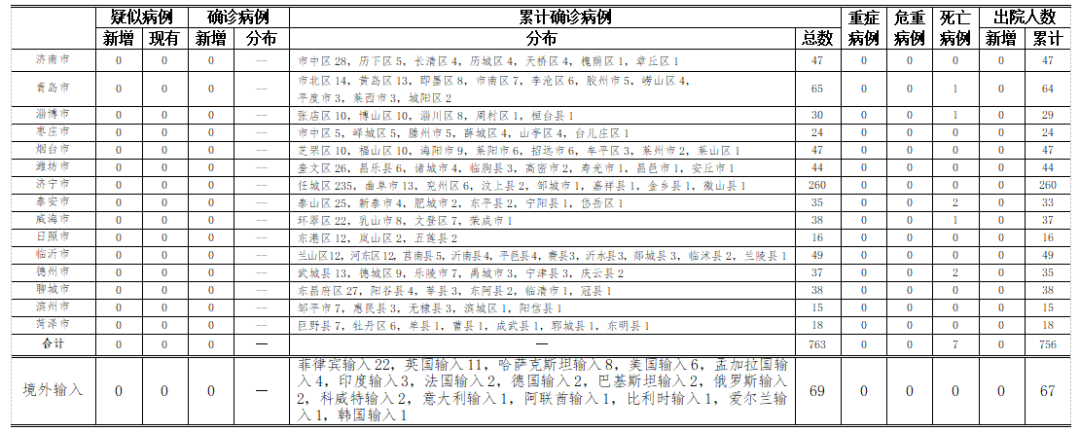 山东无本地住院疑似病例、确诊病例。累计报告确诊病例763例,死亡7例,治愈出院756例。
