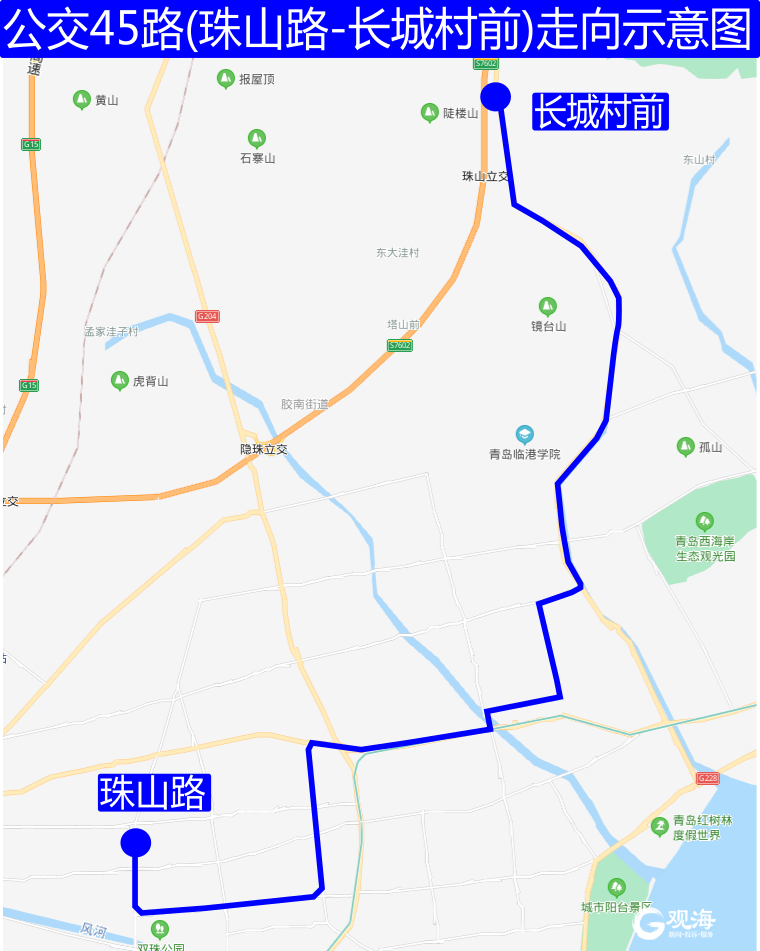由珠山路站发车沿珠山路、双珠路、水灵山路、东岳路、朝阳山路、云海路、水城路、临港路、两河路至长城村前。