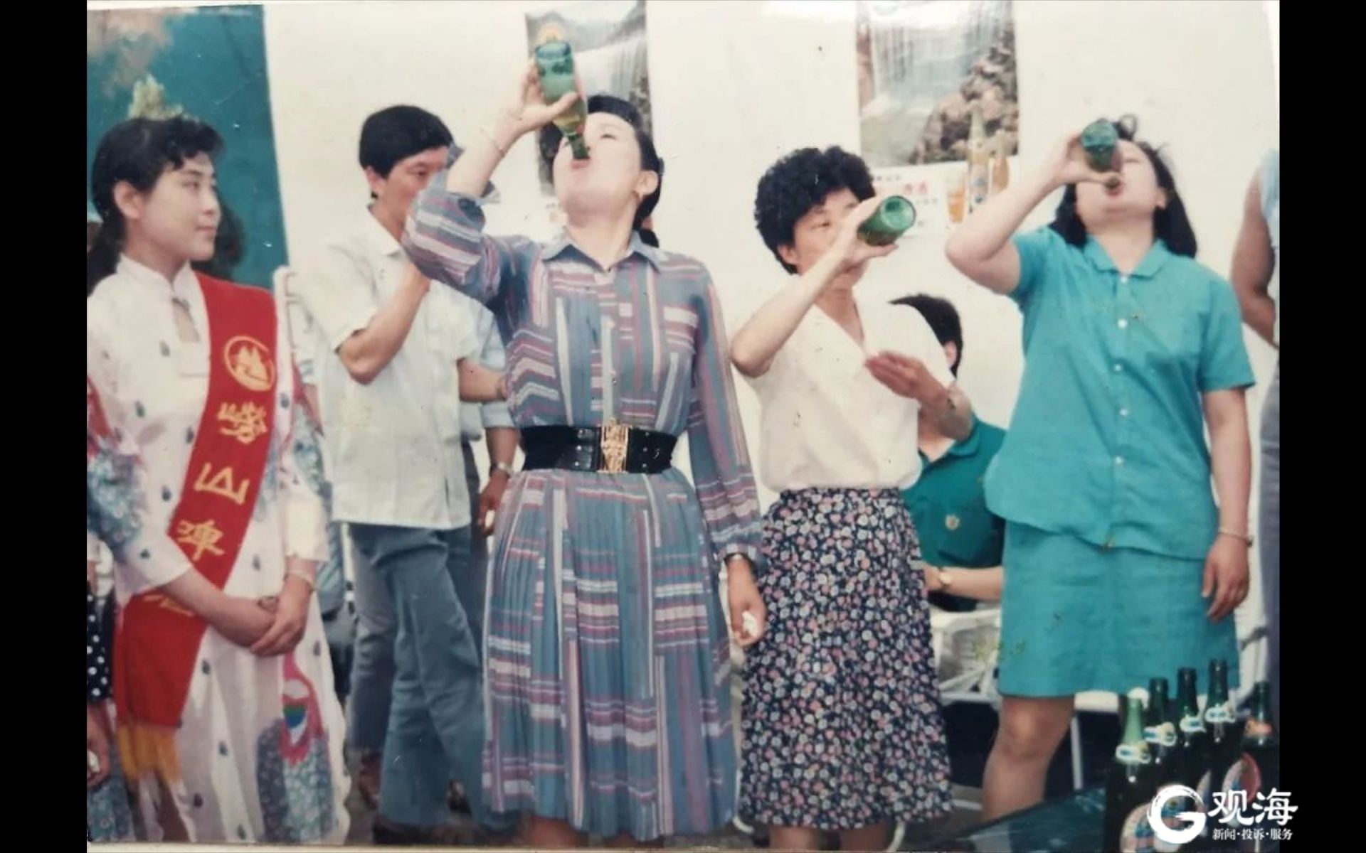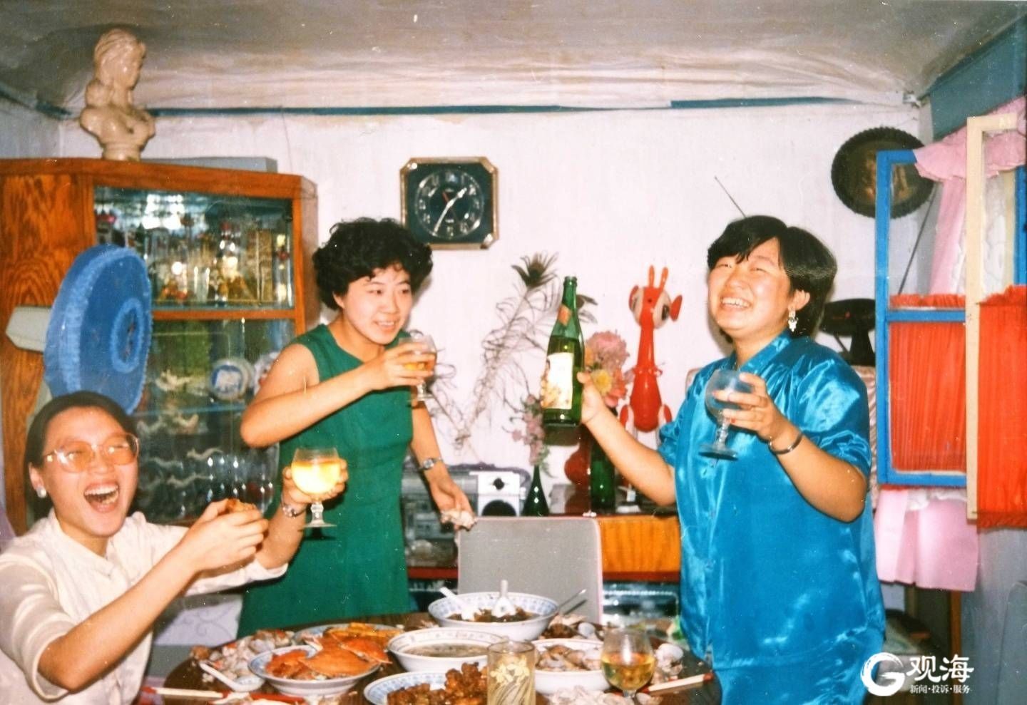 在逄淑才收藏的一张上世纪80年代末的老照片中可以看到,家庭聚会,几位女士穿着时尚的服饰,举杯畅饮女士香槟,桌上的饭菜有螃蟹、蛤蜊、糖醋里脊等,看起来比较丰盛。照片上,每人手中都有一个大玻璃杯,里面装满香槟,可见当时青岛人对“女士香槟”的青睐。