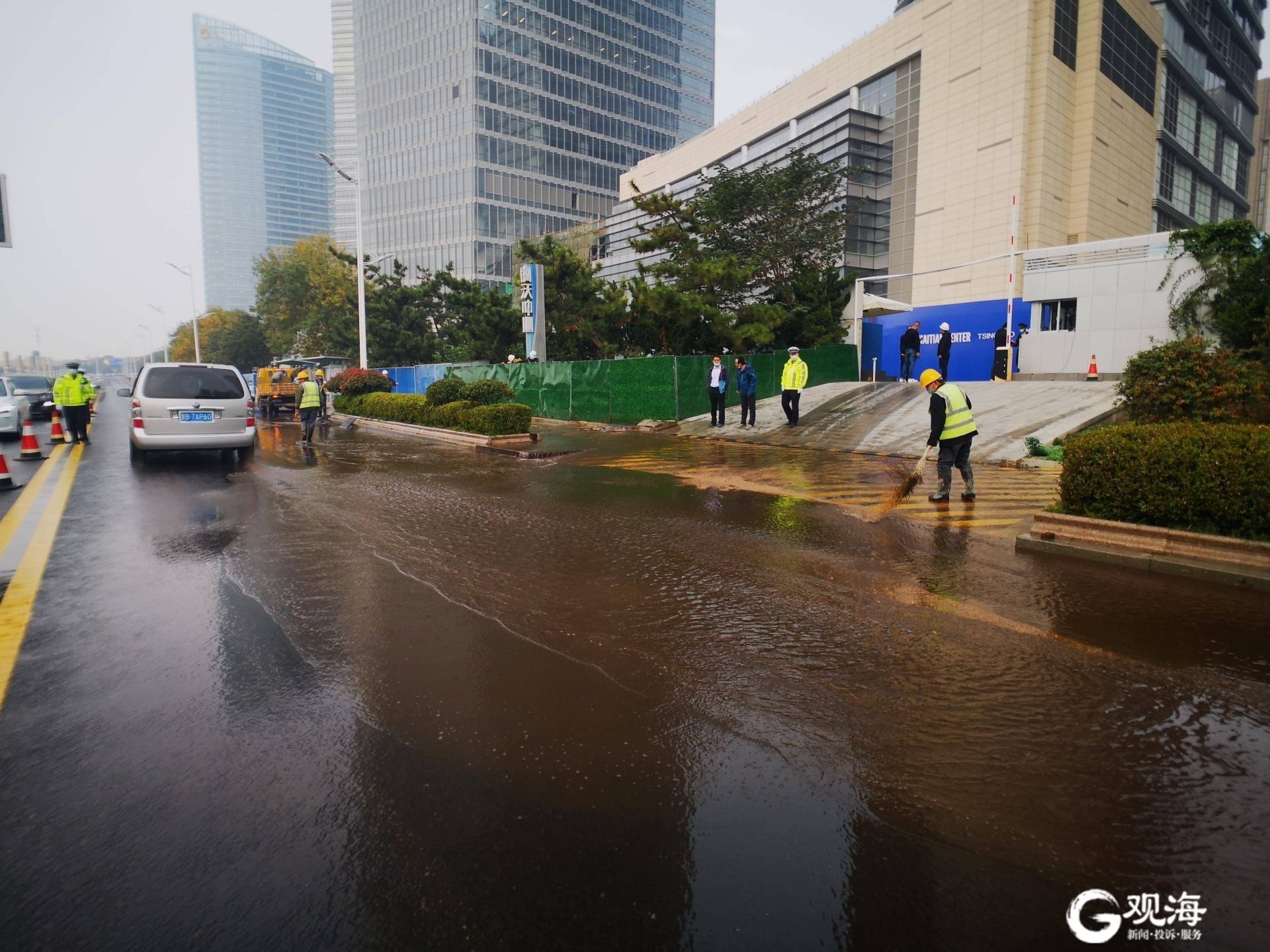 据现场施工人员介绍,发生漏水的是热力管道,具体原因不明,抢修正在进行。(青岛日报/观海新闻记者 于滈 文/图)