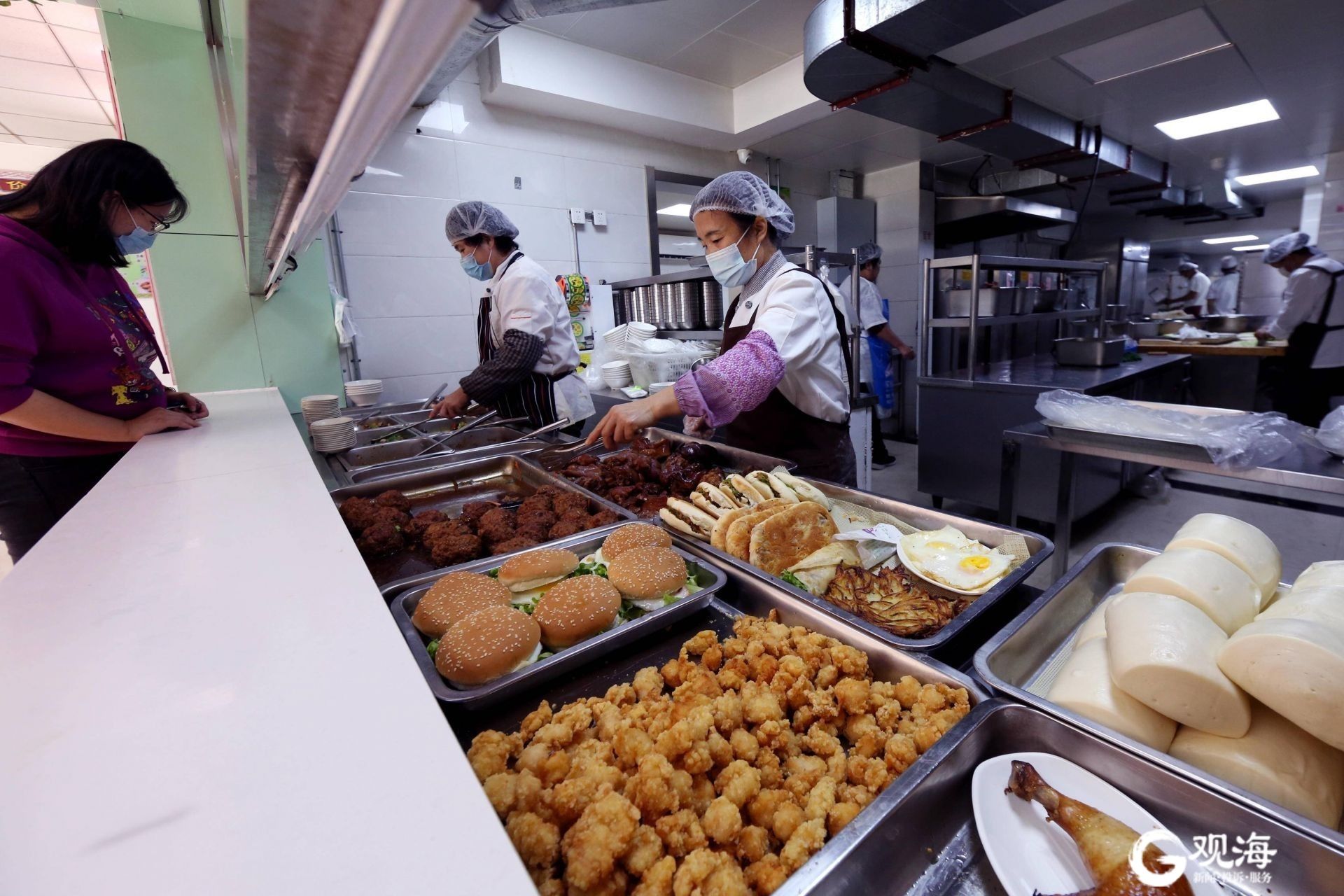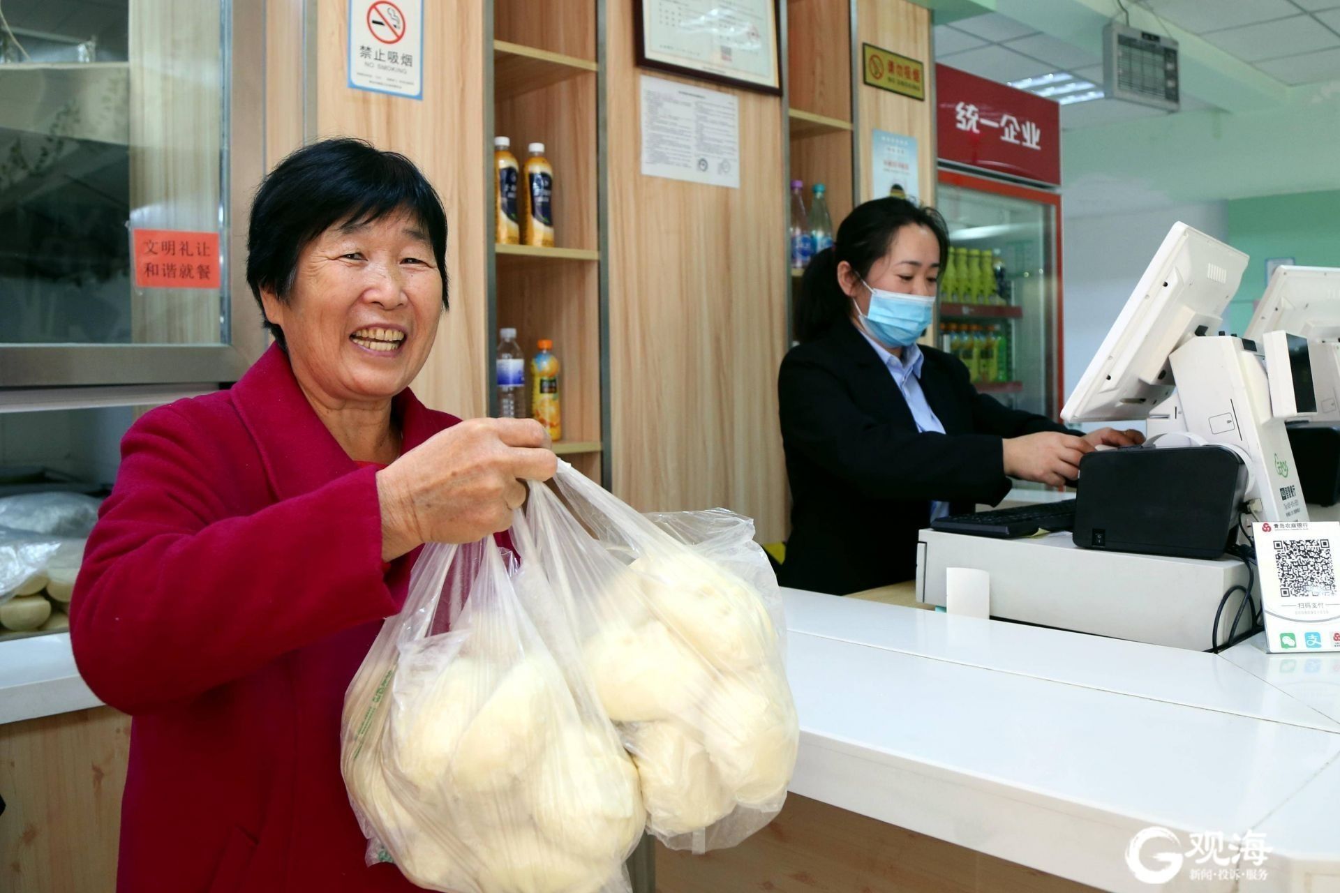 采访中,家住上流佳苑小区的臧秀云拎着两大袋黄米糕,高兴地和工作人员打着招呼。两袋黄米糕总共20个,每个相当于两个包子大小,可她只花了12元。“按照市场价来算肯定远远不止这个价,但社区有政策,年满60周岁的老人可以三折购买。”臧秀云今年69岁,她告诉记者,自从便民大食堂开业以来,家里很少开火了。“我就住在食堂旁边的楼上,到了饭点坐电梯下来就行,价格比自己做还便宜。”臧秀云和老伴把晚年生活安排得非常满,家里不用开火,给两人节省了不少时间。“要不然,每天还要忙着买菜、择菜啥的,太耽误时间了。”和臧秀云有同样想法的村民不在少数。记者采访期间,取餐口前一直排着队,大家有序取餐、结算。“今年受疫情影响,我们2月才开门营业,且4月前一直不提供堂食,只有外卖。”食堂工作人员告诉记者,疫情期间仅供应早餐、午餐,取消堂食,居民可订餐或错峰到食堂买饭。订餐标准分为20元和30元两种,社区60岁以上的老人享受就餐3折优惠,居民可通过电话预订分时取餐。到食堂买饭的居民在门口测量体温、登记后依次进入买饭,避免交叉感染。随着疫情防控形势持续向好,恢复堂食后目前食堂中午的售卖量已接近去年同期。常态化疫情防控期间,很多居民佩戴口罩有序排队,并选择将午餐打包带走。井然有序的就餐秩序与食堂门口张贴的倡导“文明餐桌”和“使用公筷公勺”的公益广告令人印象深刻。