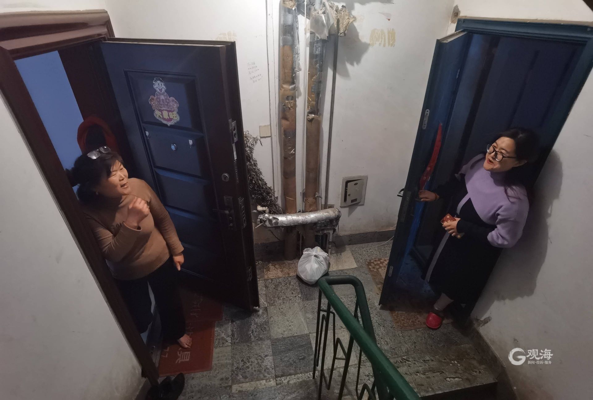 拍视频的王鹏飞(右)和参与扯电热毯救人的赵腾家住对门。