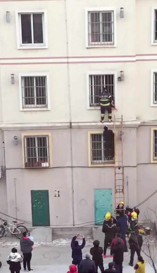“我们到场之后,看到一个小男孩的脚悬在外面,头卡在防盗窗中间,情况十分危险。”参与救援的上海路消防站消防员李鑫璞说,孩子的爸爸爬到2层楼的窗户上,一手抓着防盗窗,一手托着孩子的一只脚,楼下是几名居民扯着一张电热毯做保护。