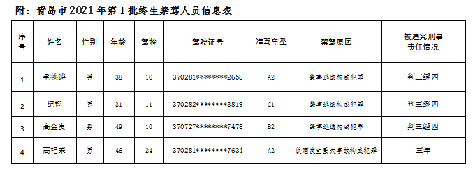 青岛日报社/观海新闻1月13日讯 观海新闻记者从青岛市公安交警部门了解到,2021年第1批终生禁驾人员名单已经公布,有4人被终生禁驾。这4名驾驶员中,驾龄集中在10-24年,都是因交通肇事逃逸构成犯罪和饮酒发生重大事故构成犯罪被依法判刑并终生禁驾。