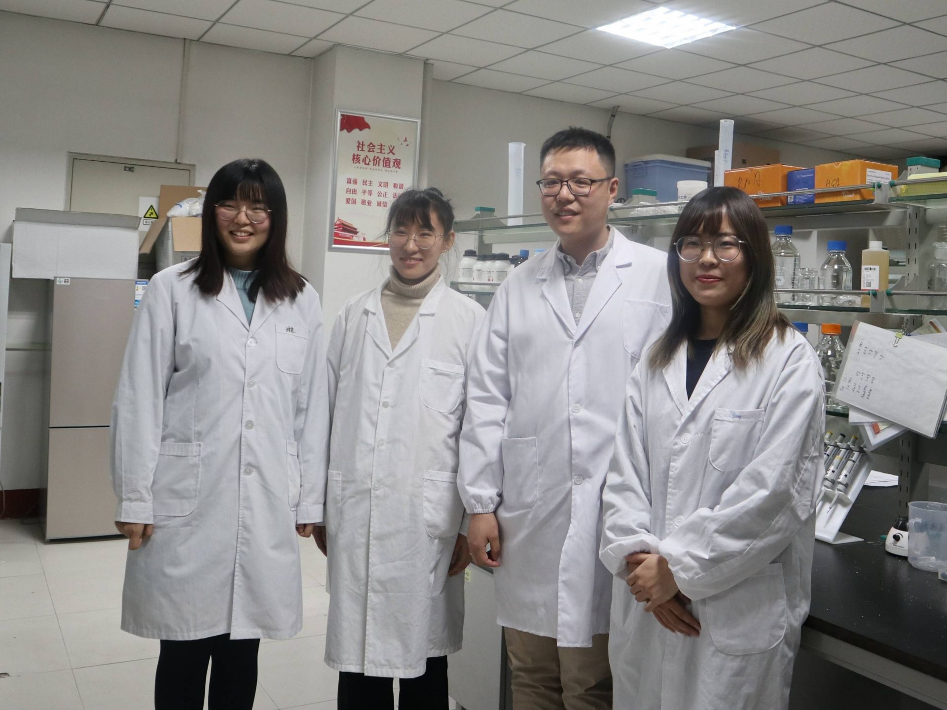 赵明辉(右二)和3名学生组成克隆猫项目研究团队。