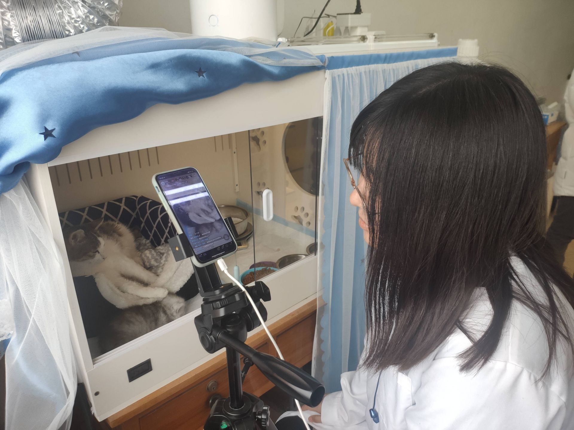团队成员李惠直播保温室内的网红克隆猫“平安”。