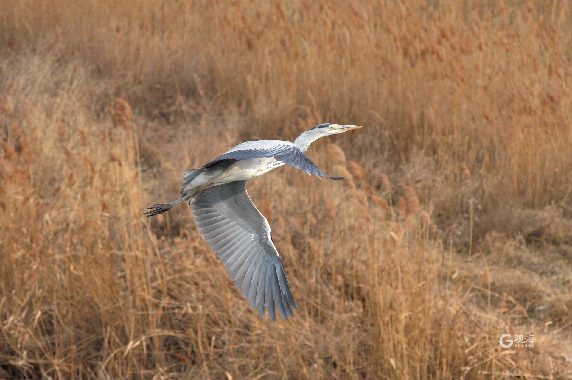 苍鹭飞过芦苇荡。