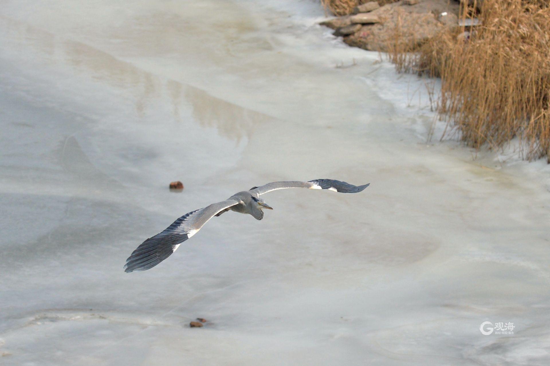 苍鹭从冰面上起飞。
