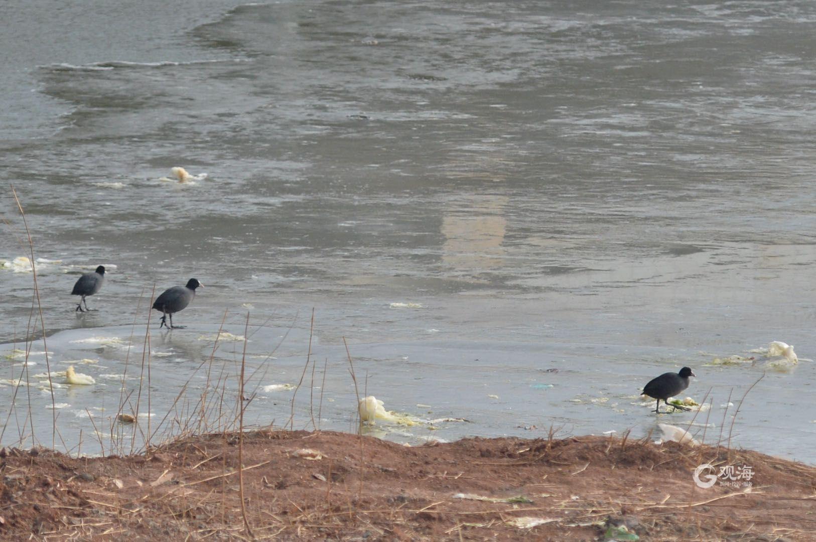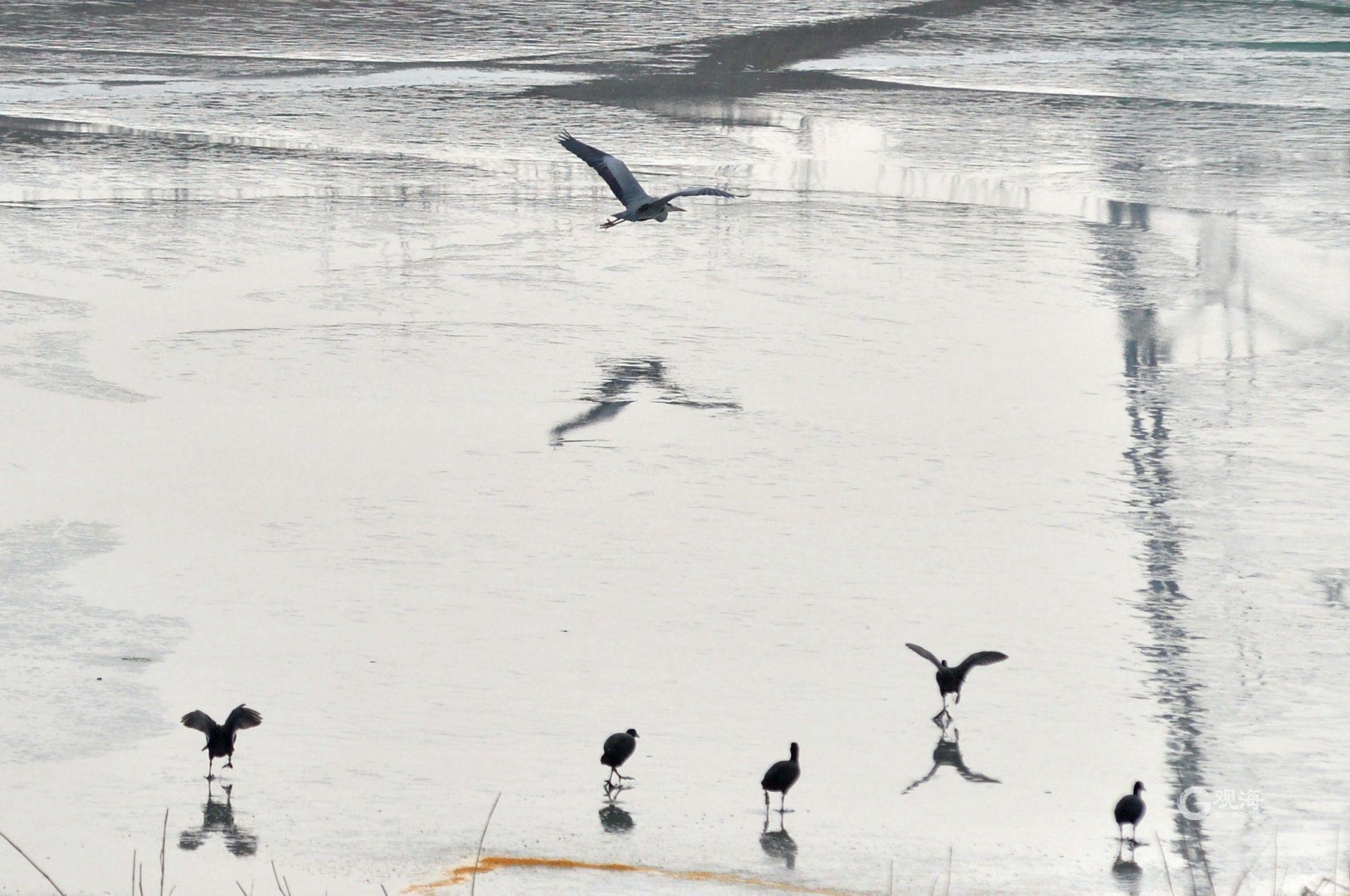 近期,青岛气温持续在冰点以下,不少河道出现大面积冰封的情况,增加了水鸟觅食的难度。观海新闻记者在桃源河沿岸看到,苍鹭、白骨顶鸡、黑水鸡、斑嘴鸭等大批越冬的水鸟聚集于此。时而飞舞、时而栖息、时而觅食……丝毫不惧严寒。