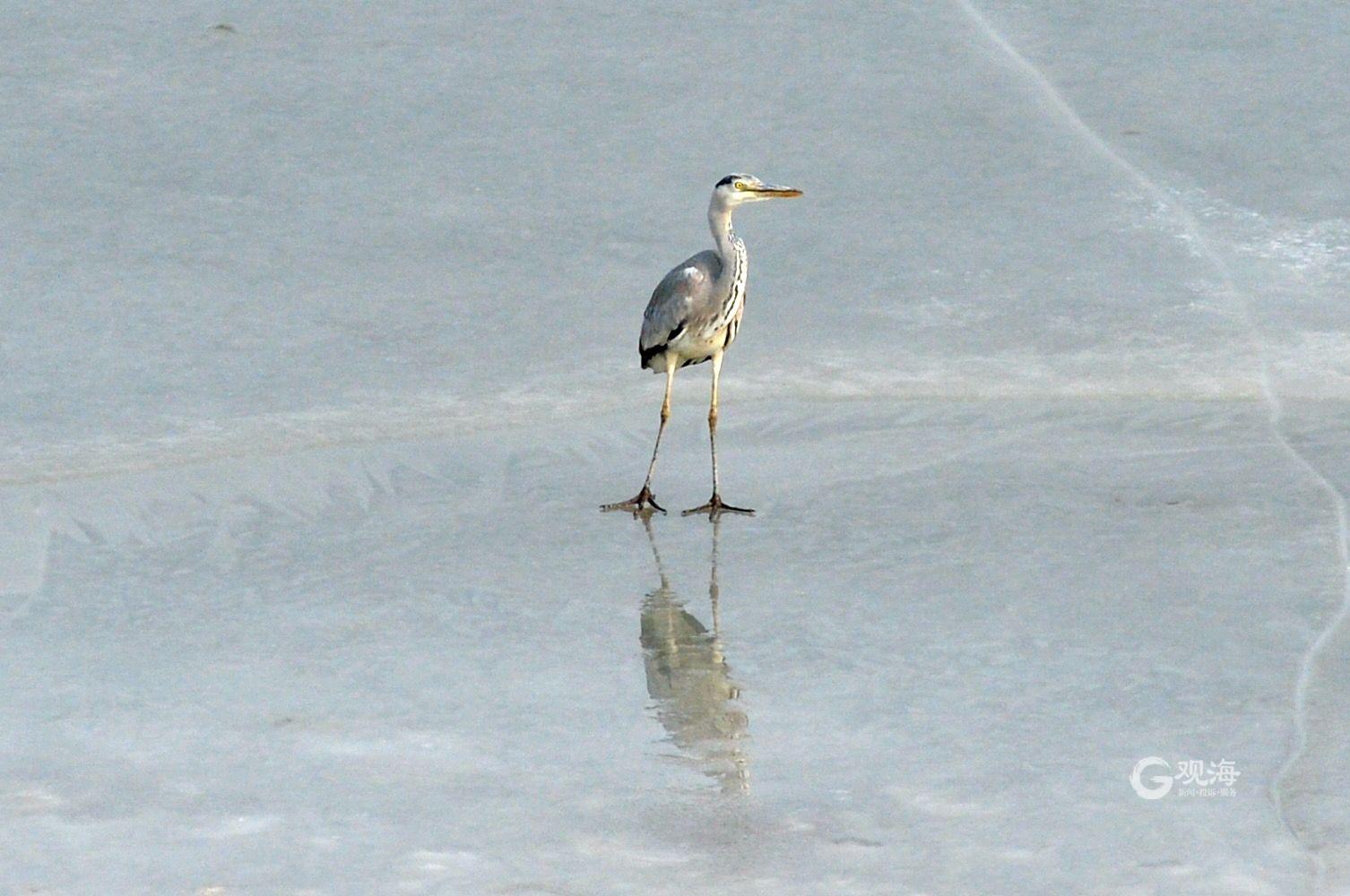 苍鹭在冰面觅食。