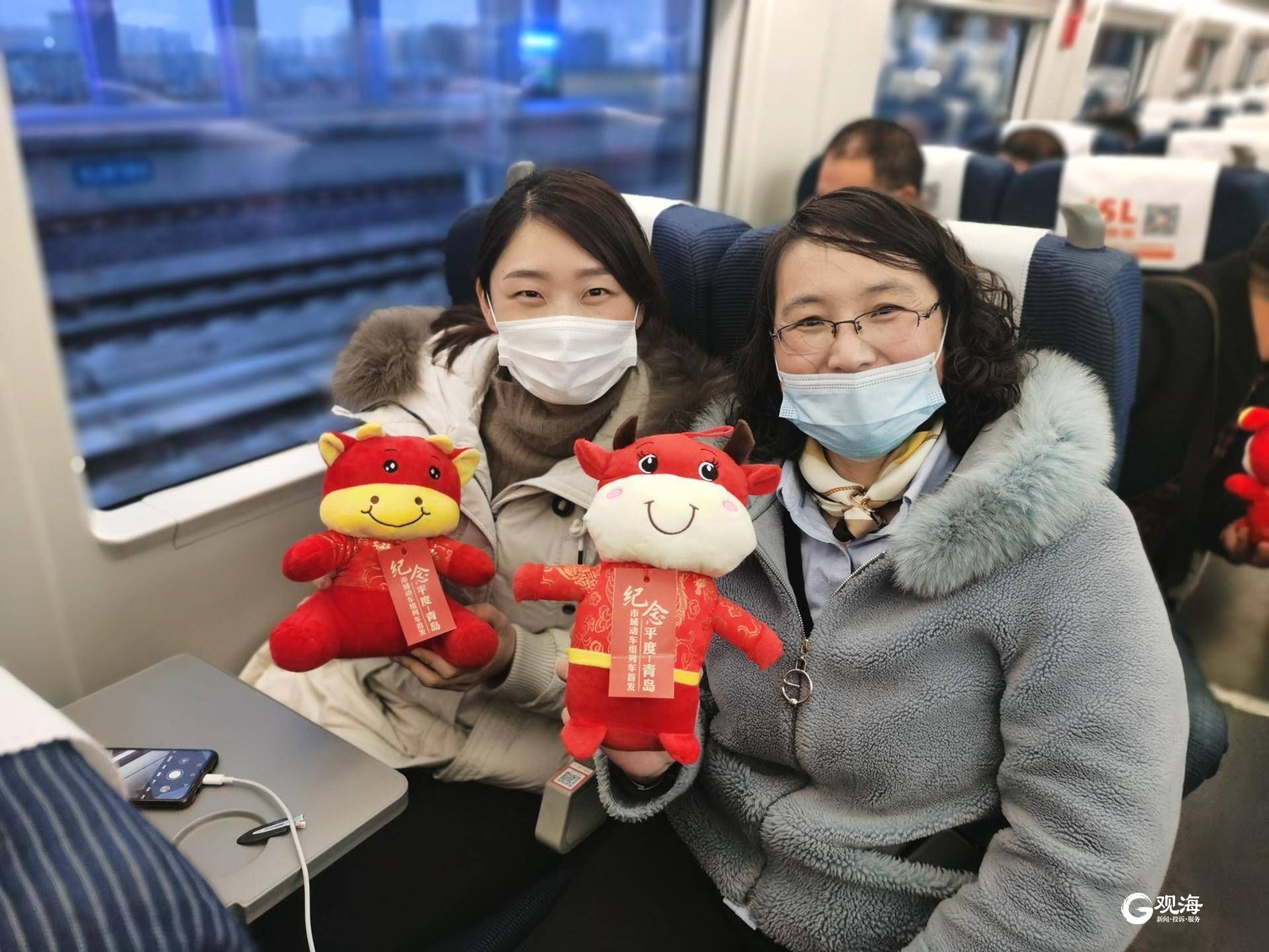 平度至青岛首班市域动车组上,乘客兴奋地展示“首发”纪念物。